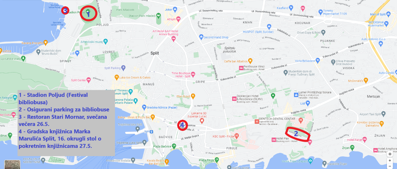 1. Poljud Stadium 2. Parking for mobile libraries 3. Stari moranr restaurant 4. City Library Marko Marulić Split